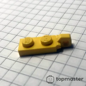 LEGO жовта пластина з hinges 1 x 2 з одиничним пальцем на кінці вертикально, без нижнього пазу, використовувалася в принаймні 20 наборах LEGO протягом останніх 22 років, починаючи з 2003 року. Цю деталь також можна знайти в щонайменше 16 інших кольорах. Дизайнерські ідентифікатори – 44301 та 49715, які зазвичай викарбувані на дні деталі.